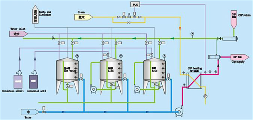 CIP站由堿罐、酸罐、消毒水罐、熱水罐組成。它應做到以下幾點功能:
